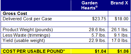 Truth While our hearts of romaine may initially cost a bit more per carton, the yield is considerably higher, so the net cost for Garden Hearts® is actually lower. But don't take our word for it. A major casino company ran yield tests several times and here are their figures: